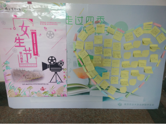 3月7日晚7时,八叉书库 “心语农苑,壹信壹影”女生节主题活动在生科楼B1013举行。本次女生节活动以写下一个心愿、观看一部电影、致未来的一封信为主线,得到了学院女同学的青睐。活动开始前,参与活动的女生利用便利贴写下自己的一个心愿,贴在展板上展示。观看一部电影环节,选择了同学们深受喜爱的影片并在结束时同学们分享了观后感进行交流。活动最后,同学们为毕业时的自己写下一封信并封存由研会保管,毕业时将会把信件寄于本人。此次三七女生节活动,丰富了研究生的业余生活,活跃了八叉书库 的文化气氛,促进了同学之间的交流。