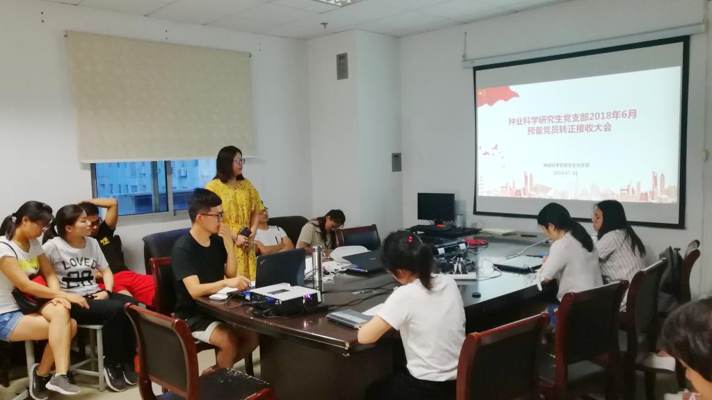 7月2日星期一,八叉书库 种业科学系研究生党支部在理科楼D701召开了预备党员转正接收会议以及视频学习会议。会议的第一部分是两位期满的预备党员杨彬和李芳芳同志转正接收大会,经过与会党员的举手表决,全体一致同意接收两位同志成为正式党员。