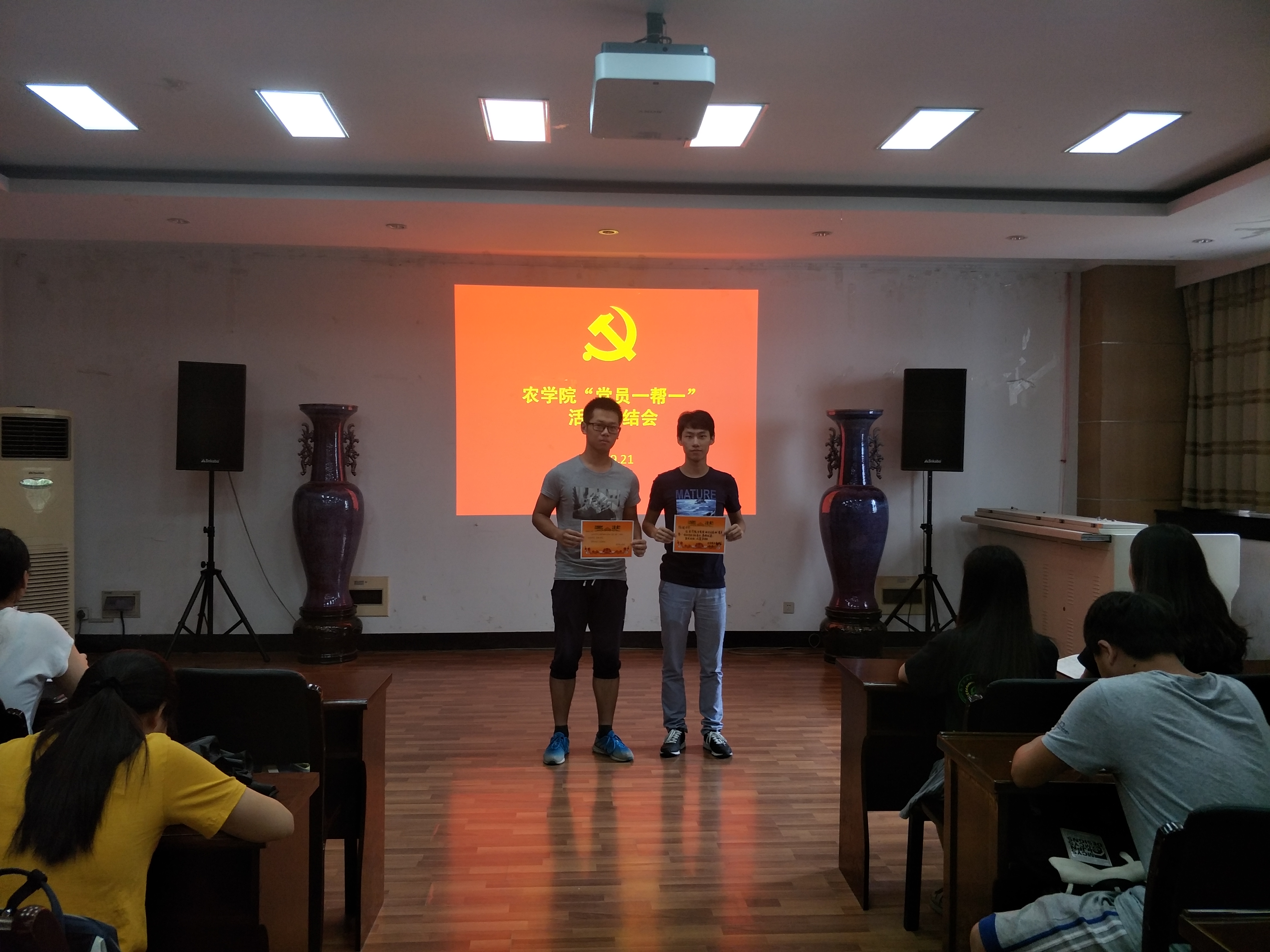 接下来,考核优秀的预备党员代表陈健和宁思寒同学上台跟大家分享了自己在“党员一帮一”活动中的经验和感想,最后实践部部长也对本次活动作出总结,提出建议和要求。