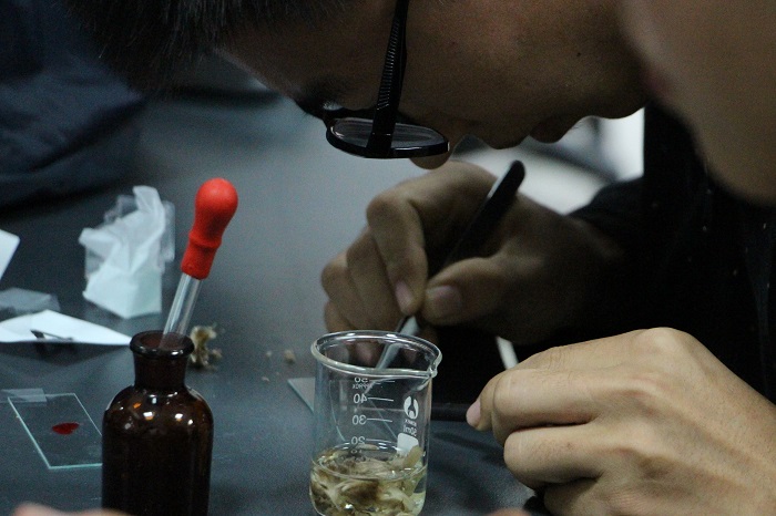 决赛时,十组参赛选手就“棉花花芽分化观察”实验和“蚕豆花减数分裂观察”实验进行操作竞争。实验现场,同学们仔细认真,力求完美。评委老师也根据选手的操作过程、实验结果等做出评判。最终“大树树”队表现优异,拔得头筹。