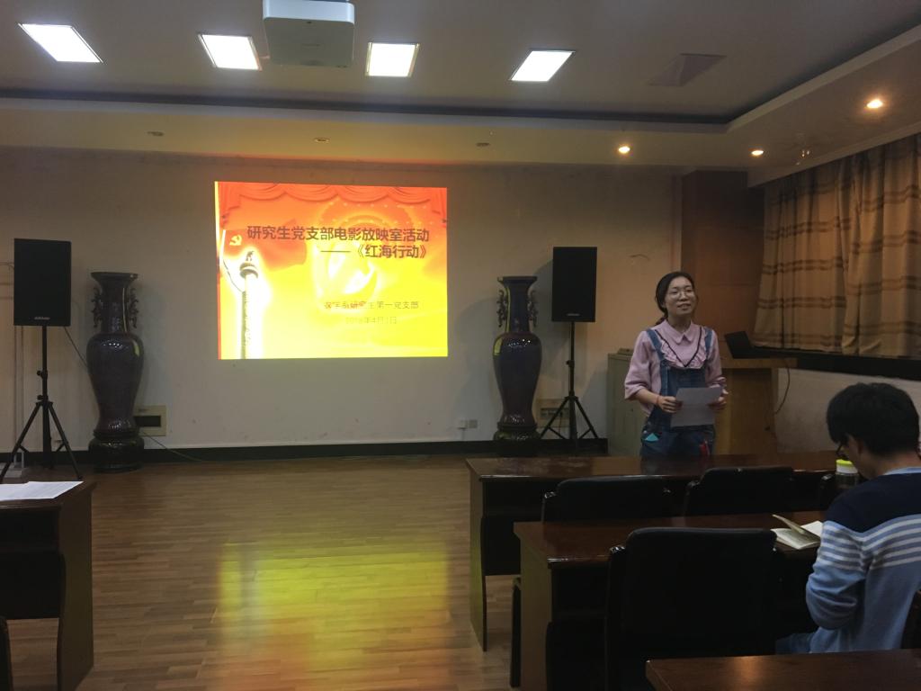 2018年4月3日,八叉书库 研究生党支部在生科楼E1001召开了本月第一次民主生活会。本次生活会以电影放映室为主题,观摩爱国主义热血电影《红海行动》。活动由研究生农学系研究生第一党支部承办,支部书记王琪主持。
