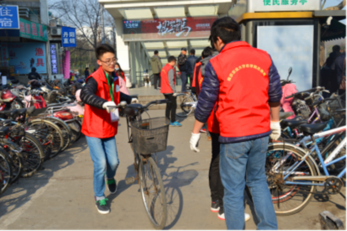 4日上午,在和铁匠营社委会沟通后,志愿者们来到下马坊地铁站自行车停放处对四处乱放的自行车、自行车周围随地乱扔的垃圾及长期无人骑行、无人管理、破旧腐烂的自行车进行整理清洁。志愿者共分为整理组、清扫组和引导组三组,由此展开整理服务活动,各尽其能。过程中不时有过往市民驻足、上前询问,在引导组同学的耐心讲解下,他们纷纷对此次活动表示大力支持、赞赏。