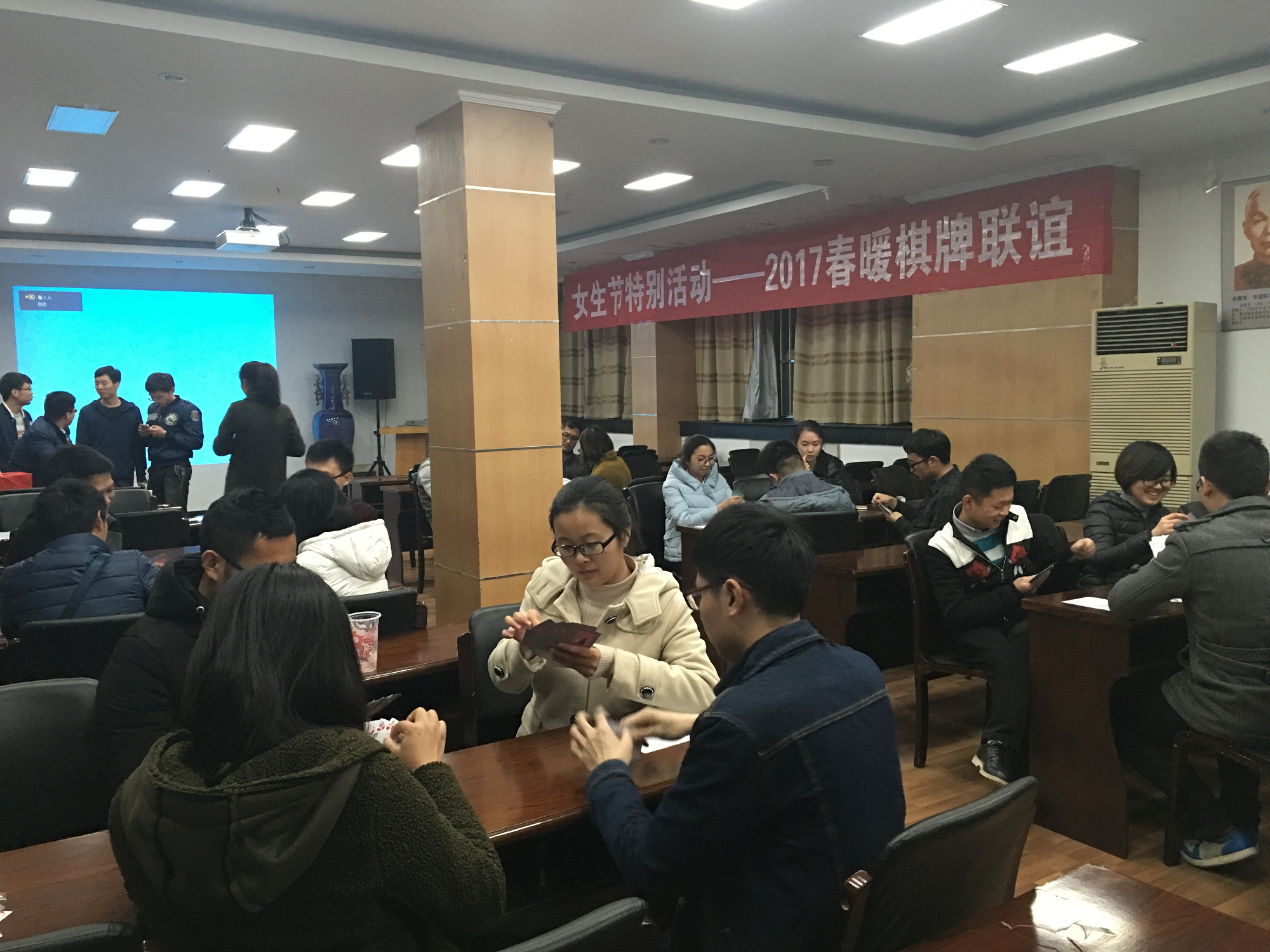 为了丰富研究生课余生活,响应校研会“社区文化节”活动的号召,让更多同学积极参与到丰富多彩的校园文化生活之中,3月7日晚上,八叉书库 与人文与社会发展学院在八叉书库 报告厅举办了“女生节特别活动——2017春暖棋牌联谊大赛”。此次活动的参与对象为全校研究生。本次联赛主要分为三个部分进行:掼蛋大赛,五子棋大赛和象棋大赛。
