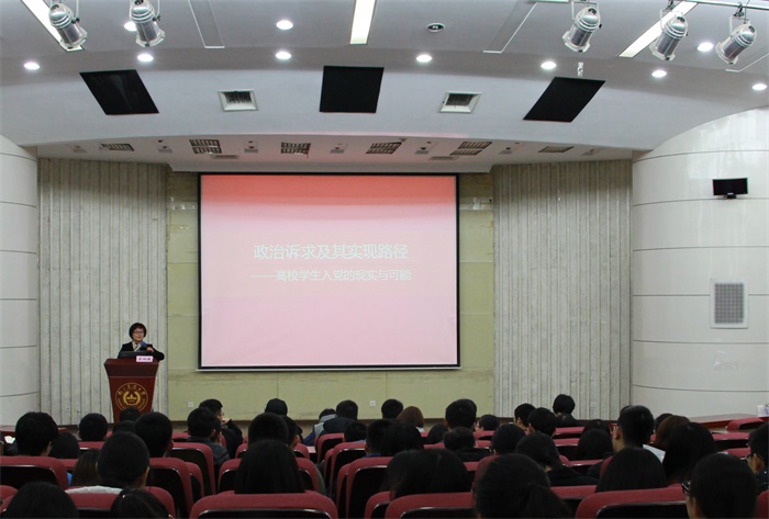 余林媛教授首先以入党的理性思考为切入点展开了本次党课教育。从理性型,感性型,功利型三种入党动机讲起,阐述了加入中国共产党的动机。并指出同学们应把政治诉求与自身发展结合,把入党作为参与现实生活的一种身份或资格,作为实现个人发展的条件之一。紧接着余教授又详细地从政治学、社会学、哲学三个视角来阐明入党是实现政治诉求的重要途径,入党是成为社会精英的基本要素,入党是实现人生价值的必要条件等观点。