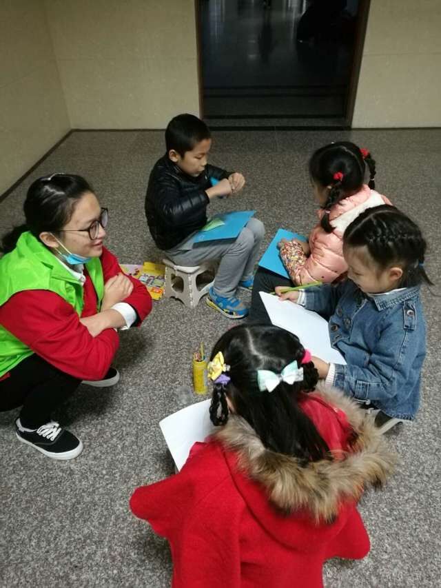 3月13日,小绿叶课堂在逸夫楼南广场正式开始。四点半老师们陆续把孩子交到志愿者手中。志愿者身穿绿色志愿者服装佩戴志愿者证,期间志愿者们还准备了蜡笔、彩色铅笔、卡纸以供小朋友们画画。