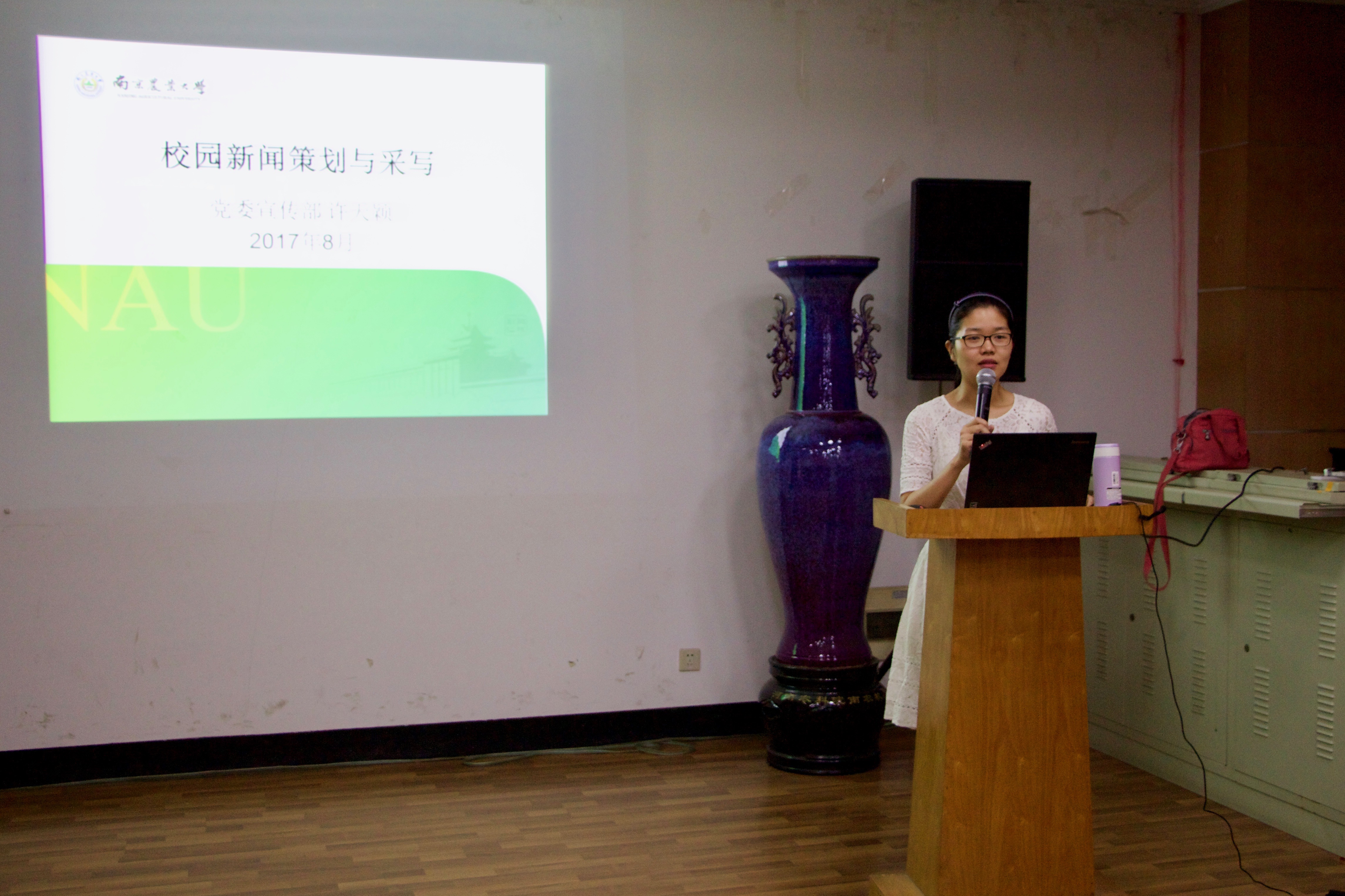 8月30日上午,校党委宣传部全媒体中心许天颖老师受邀主讲校园新闻的策划与采写。在一个半小时的时间里,许天颖老师详细地讲述了关于校园新闻的策划与改写的整个过程和具体要求,包括新闻的发现、策划以及采写的要点和规范内容。其中许老师着重讲解了如何发现值得报道的新闻、采访技巧和新闻的结构形式,并举了三篇新闻作为例子来说明新闻六要素和撰写的具体结构。许老师还强调要根据时令和学院特色对新闻进行提前策划,并为院学生干部提出了一系列关于迎新期间新闻采集与撰写的宝贵建议。许老师在最后提出,在新闻媒体的各个方面都在不断的改进的当代,校园新闻的语言风格应以追求短、平、快为目标,希望15级八叉书库 学生干部能在原有新闻内容的基础上去创新和思考。