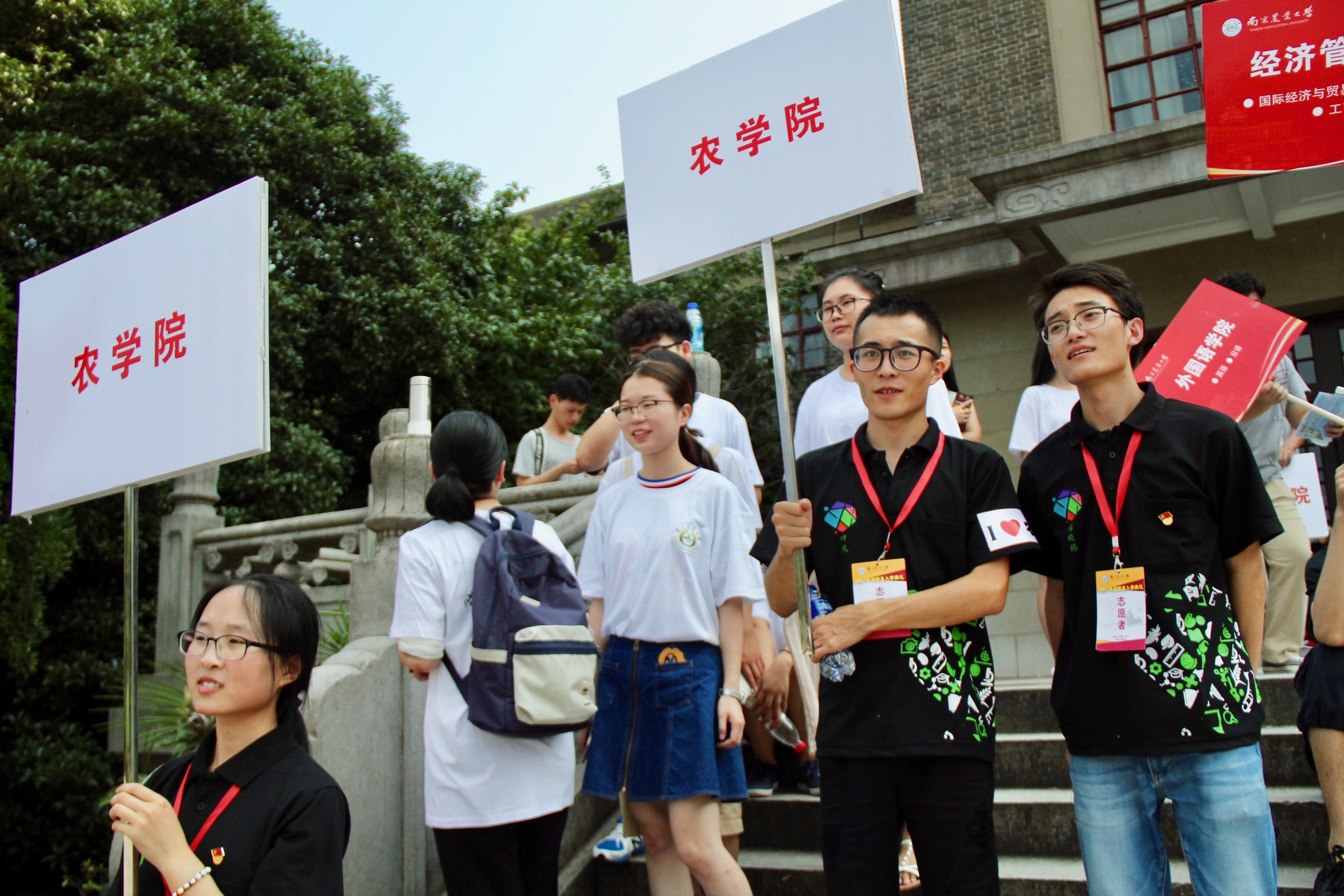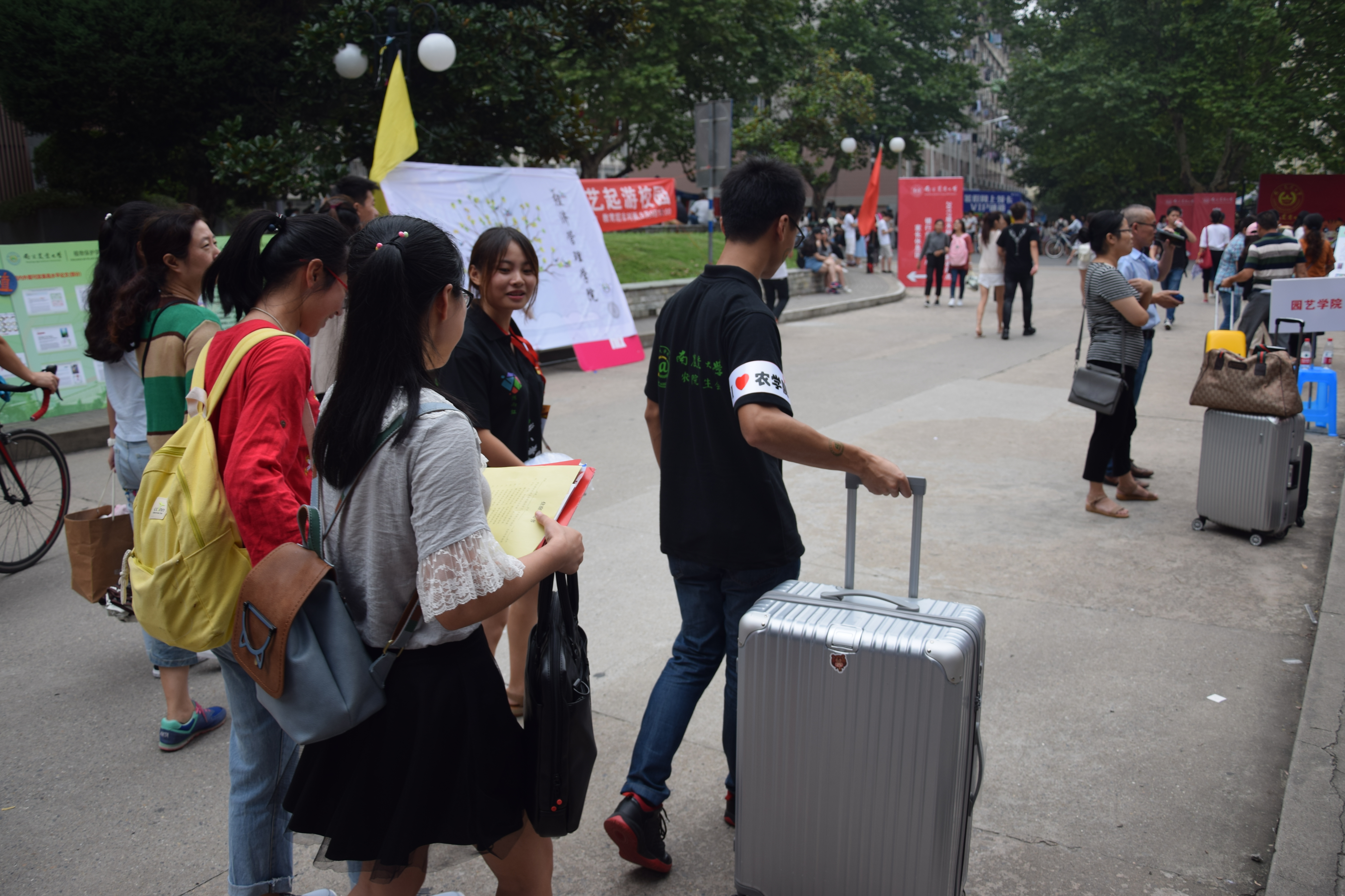 这次的迎新路线同往年一样,是从新同学们踏进校园的那一刻就开始了。从北门到主楼设置了三个等待新生的迎接点。学长学姐们高举着醒目的牌子,焦急地等待着每一个八叉书库 的孩子,期盼着可以领着他们去到报到的地方,开启他们大学生活的第一个篇章。