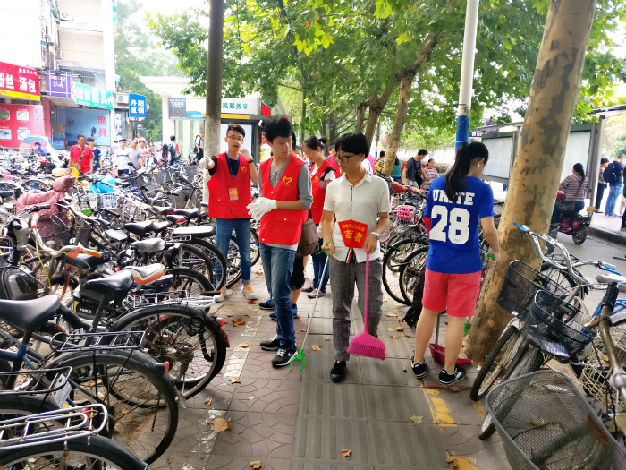 9月24日,为整治学校附近的自行车停放秩序,八叉书库 青年志愿者大队与孝陵卫街道铁匠营社区携手合作开展了“稍序,立整”项目,对市民随意摆放的自行车进行整理。