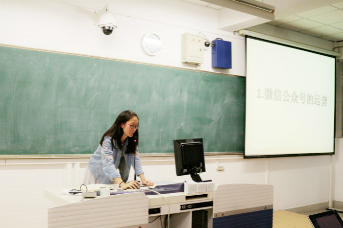 培训共两个部分。首先方天对PS中工具栏的基本使用以及光线的调节、水印的去除等进行说明,并在现场进行了PS技术的展示。之后王怡婧对微信公众平台的基本知识进行讲解。内容包括微信公众号的基本介绍及后台功能的介绍、风格与素材的选择、内容的编辑、编辑器的使用、遇到的问题及微信公众号的推荐。讲演过后,方天和王怡婧对同学们疑惑做出解答。