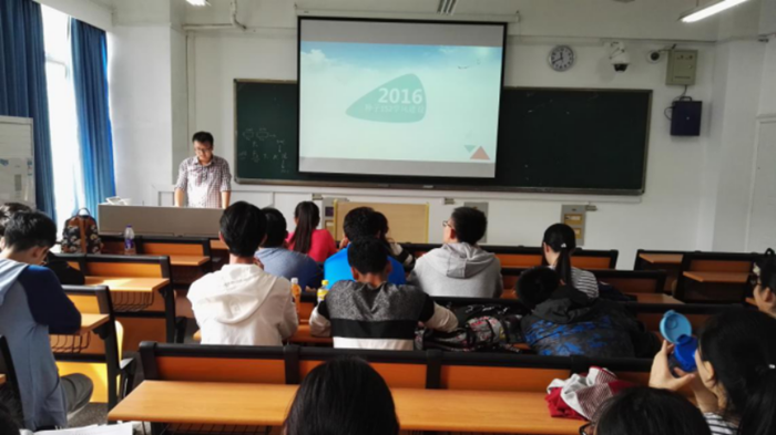 班会第二项,赵鹏学长和董鑫学姐来分享学习经验。讲述了一些可借鉴的学习方法以及他们所了解的保研、出国留学等事例。同学们都很认真聆听学长学姐的谆谆教诲。