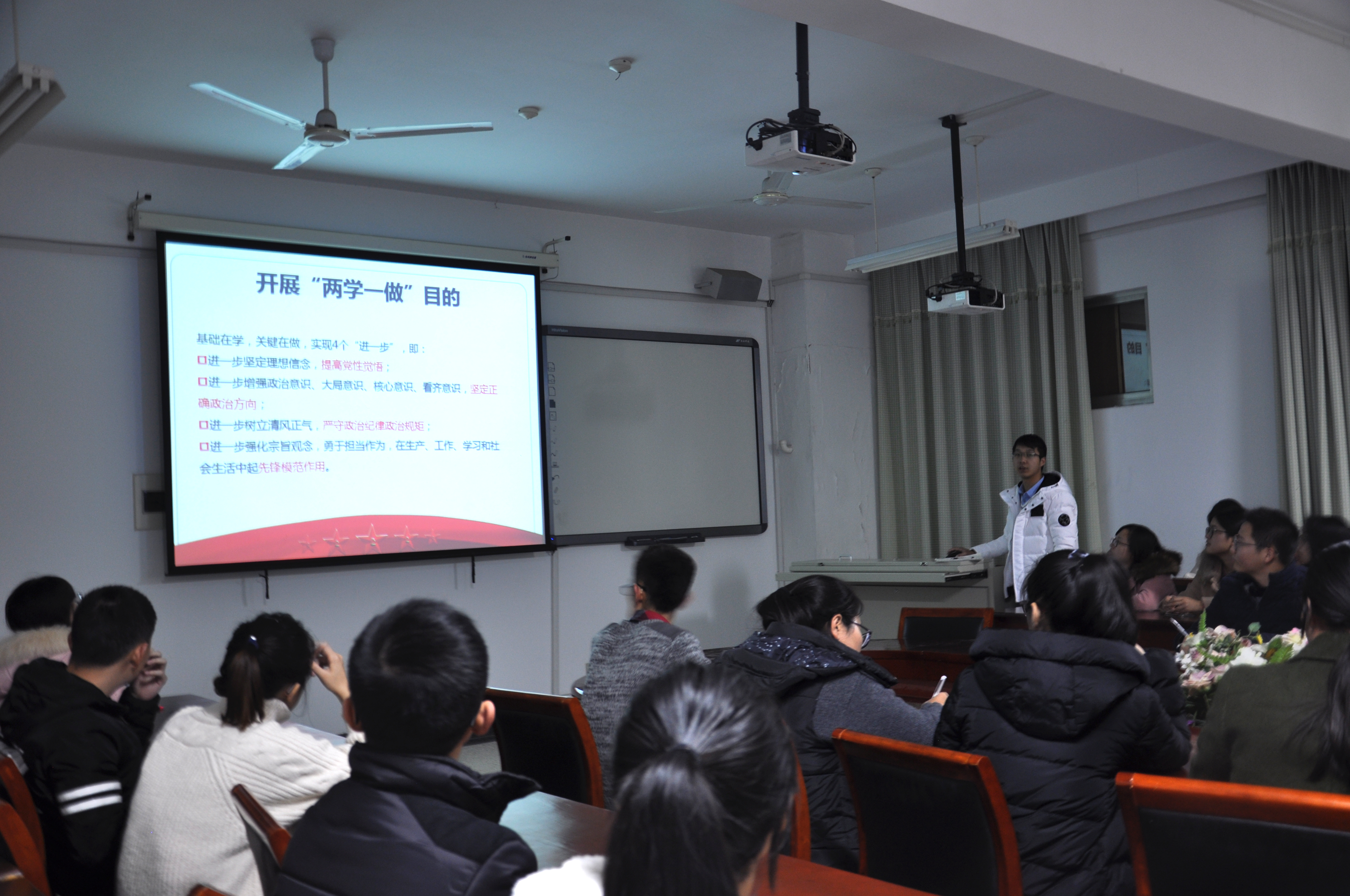 研究生第一党支部在生科楼B3012举办了积极分子和预备党员推优大会暨“两学一做”理论知识学习。此次会议主要包括积极分子和预备党员的推选、预备党员的成长汇报和“两学一做”知识理论学习。出席此次活动的人员主要包括支部书记、支部副书记、宣传委员和组织委员等32名正式党员对汇报的同学进行投票。