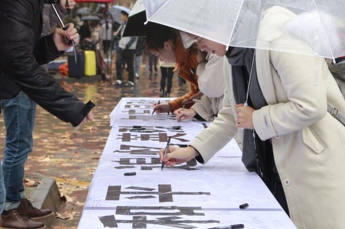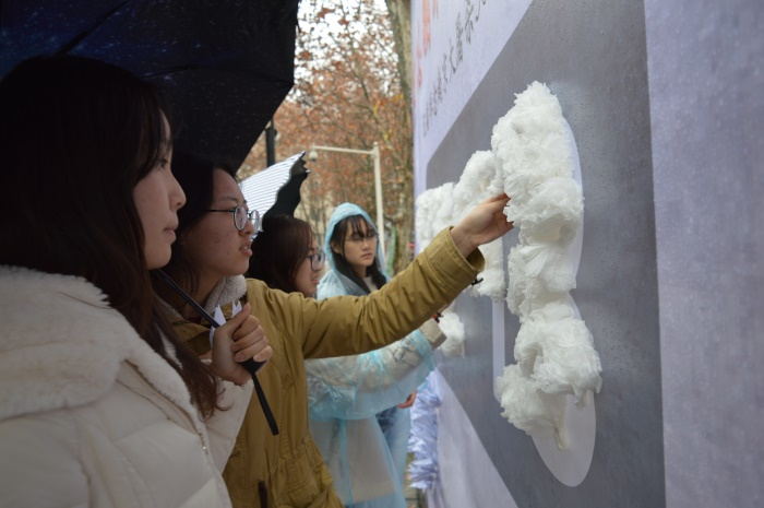 中午11:30,在八叉书库 玉兰路,八叉书库 团委学生会组织了百人签名活动。细雨蒙蒙中,同学们在写有“铭记历史,珍爱和平,追忆英烈,勿忘国耻”的白色横幅上郑重地签下自己的名字,写下自己对和平的美好期盼。此外,同学们还用自己亲手折的纸菊和千纸鹤在背景墙组成了“12•13”的字样和和平鸽的形状,借此来缅怀在南京大屠杀中遇难的30万同胞以及为抗日战争作出卓越贡献的革命先烈。