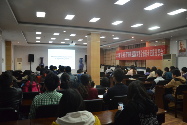 研究生会徐心杰同学主持。首先,胡伟同学对自己的生活、学习、 科研等方面做了简单的介绍,建议大家在阅读文献之后先做好实验规划,有目标地完成实验的每一步,并且端正好自我心态,在发现、解决问题的过程中不断地提高自身素质与能力。随后,朱莹同学着重讲了自己获得高校录取的经验以及对英语学习方法的分享。之后,侯富同学以幽默诙谐的方式与在场同学分享自己的人生目标与科研态度,另外他认为在实验过程中难免会遇到问题,与导师及时的交流对问题的解决至关重要,并且提醒我们需要注意劳逸结合,找到适合自己的学习和生活方式。最后,徐蒋来同学以自己的切身经验为我们分享了他的国奖之路。4位同学以渊博的知识和风趣幽默的讲解,获得了同学们的一致好评。