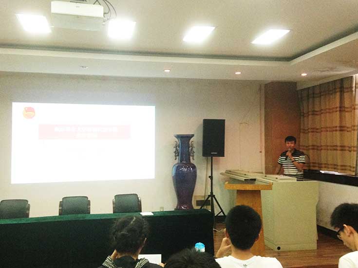 随后姚敏磊宣布了本次优秀团队的评选结果,获校级一类重点团队立项1个,获校级二类团队立项2个,获院级立项团队4个,获院级立项专项团队1个,并由团队队员代表上台领取了队旗。接着,王彬对本次社会实践的全体同学进行了培训讲座,包括社会实践的目的意义、方案设计、调查方法、论文格式等,引导大家对社会实践有一个较为全面和正确的认识,以顺利完成此次实践。同时他着重强调了社会实践过程中的安全问题,希望带队老师和各队队长能够协调负责好队员的活动情况与安全问题。 培训过后,由2013级社会实践优秀代表冯建铭和张祎璇分享交流了实践经验。