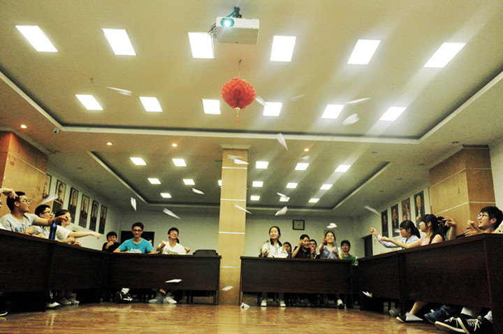班会分为三个环节。首先由学生回答引入社会主义核心价值观的内容,然后对民主,文明,和谐等12个词进行“拍卖”,拍卖到的小组上前分享对该词的理解和感悟。激烈的拍卖现场,精彩的演说把班会带入一个高潮。紧接着播放了名为《大村姑》的视频,关于女排的励志故事让大家感动不已。最后一个环节,大家按照主持人的要求在纸飞机上写下自己的梦想,放飞纸飞机。纸飞机划出优美的弧线,由主持人分享大家的梦想。