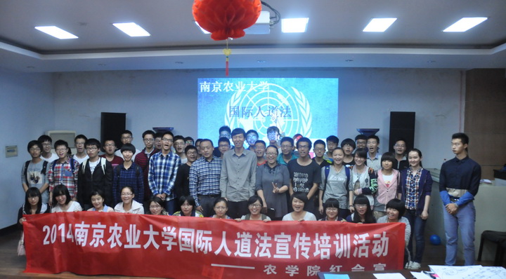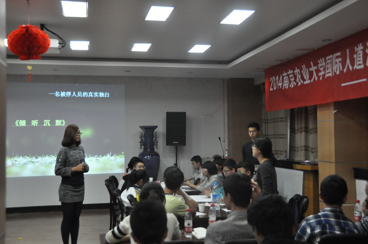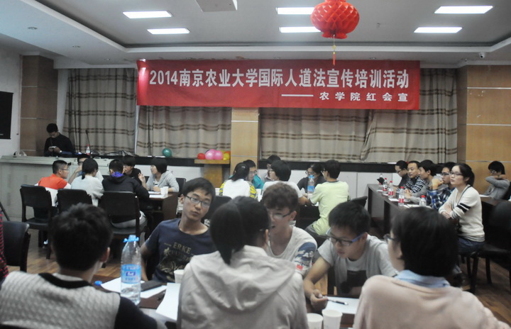 10月26日,2014年八叉书库 国际人道法宣传培训活动在生科楼E1001多功能放映厅举行。江苏省红十字会陈大玲老师、南京市红十字会江伟老师、八叉书库 辅导员王彬老师、八叉书库 红十字会会长刘航和八叉书库 红十字会会长李吉以及部分八叉书库 14级本科生参加本次活动。活动由校红会国际人道法培训主持人李甜甜和八叉书库 文艺部池驰主持。