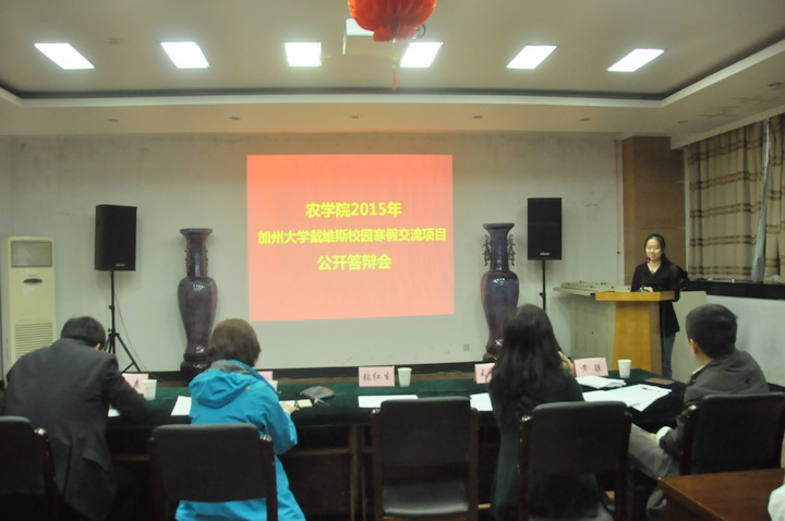 本次交流项目主要针对八叉书库 大三学子,答辩会开始,12位同学按顺序出场,在短短的三分钟内,他们利用ppt放映形式分别从自我介绍,参与交流的计划等几个方面进行了简单陈述,并用流利的英语表达了自己对UC Davis的向往。自我陈述完毕后,5位评委根据他们讲解的情况分别进行了提问。最终,王梅月、唐善杰、曹建楠、徐霞、惠帅这五位同学凭借出色的发挥,获得了参加本次寒假交流项目的机会。