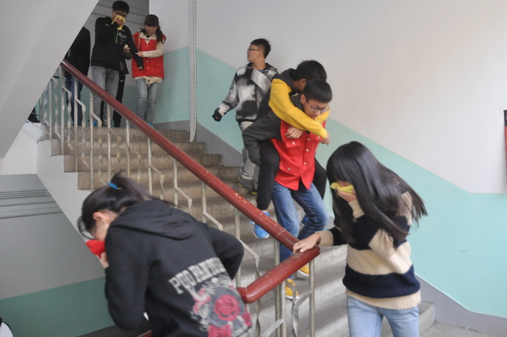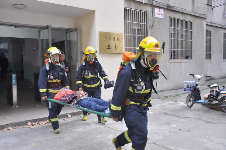 随着前期准备工作的完成,所有参与演习的学生以及工作人员在各自所属的位置上待命,消防车从玉兰路驶向5舍,演习正式拉开了序幕。“火情出现!”5舍416房间的窗户冒出了滚滚浓烟,一名男同学在冒出烟雾的窗口捂住口鼻呼救挣扎试图准备跳楼。这时,火情侦察员拨打了“119”火警电话,并拉响了警报,随后学校保卫处与校医院的工作人员赶到现场。紧接着,几名消防官兵迅速冲下消防车,铺好消防管道,打开消防栓控制周边火情,另外两名消防员从工具箱内取出担架,带领负责救援的同学,换上隔热服,冲进5舍,进行人员搜救。几分钟后,楼门口有大批学生经楼梯跑出宿舍楼,用毛巾捂住口鼻,成功疏散。随后,两名身穿隔热服的消防队员把一位“受伤”的同学用担架抬出,并配合校医院的医护人员进行现场“紧急治疗”。在确保所有人员顺利逃出楼道,伤员抢救完毕之后,消防演习活动成功结束。