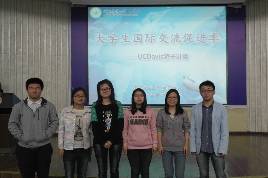 惠帅、曹剑楠、徐霞、王梅月、唐善杰依次上台分享了他们在美国UCD的学习、生活情况。围绕学习,他们给大家展示了UCD的校园风光和课堂情况。高大上的实验室,萌萌哒的小动物,还有充满趣味的学生农场给在场的同学们留下了深刻的印象。曹剑楠学姐畅谈了她在美国的所见所闻,让她重新思考了“农民”这一概念,憧憬了作为新一代准农业技术者的发展计划。在提到课余生活部分,几位学长侃侃而谈,欢快的家庭聚会让同学们纷纷投去了羡慕的眼神。在讲到各自的三餐时,他们或吐槽或赞赏,整个会场顿时充满了欢声笑语,而气势“磅礴”的“南农飞车党”又让大家体味到了游学生活的艰辛和不易。大洋彼岸学习生活不仅给游学的学子们带来了一场不一样的人生体验,同时也鼓舞着在座的同学努力朝着自己的目标奋勇前行。