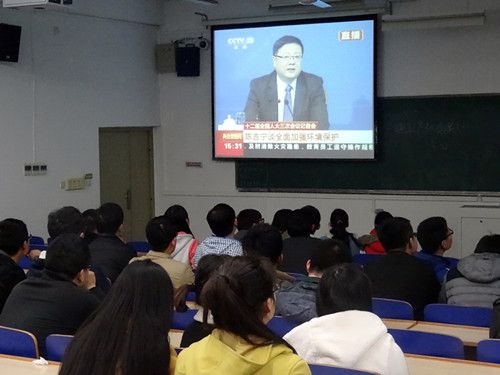 2015年3月3日至3月15日,全国人大和全国政协会议在北京隆重举行。为了让八叉书库 研究生党员及时全面地领会刚刚闭幕的两会所传达的精神,3月21日晚7:30在教学楼C103,八叉书库 研究生党支部组织研究生党员和入党积极分子观摩两会热点视频:《关于环保部部长陈吉宁谈全面加强环境保护》。