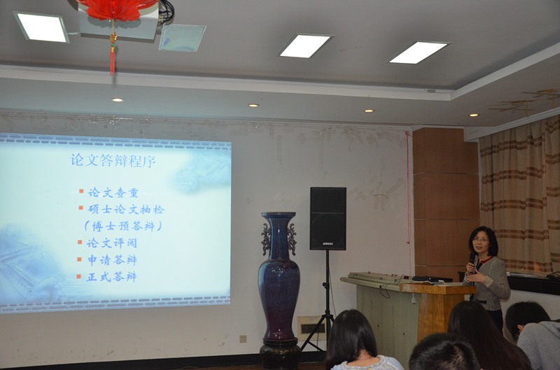 李雪琴首先就目前八叉书库 硕士学位申请与论文答辩的相关流程以及注意事项,从论文答辩条件、论文答辩程序两个方面对应届硕士毕业生们进行了深入浅出的指导。此外,她还特别强调从2013年开始实施的论文查重环节,并在会上耐心介绍了博士生预答辩申请、硕士毕业抽检、申请学位等论文答辩的程序与相关具体要求。其后李老师对同学们提出殷切期望,即在把握时间走好答辩流程的同时,为研究生与博士生研究生涯画上完美的句号,最后她给在场同学送上了美好祝福。