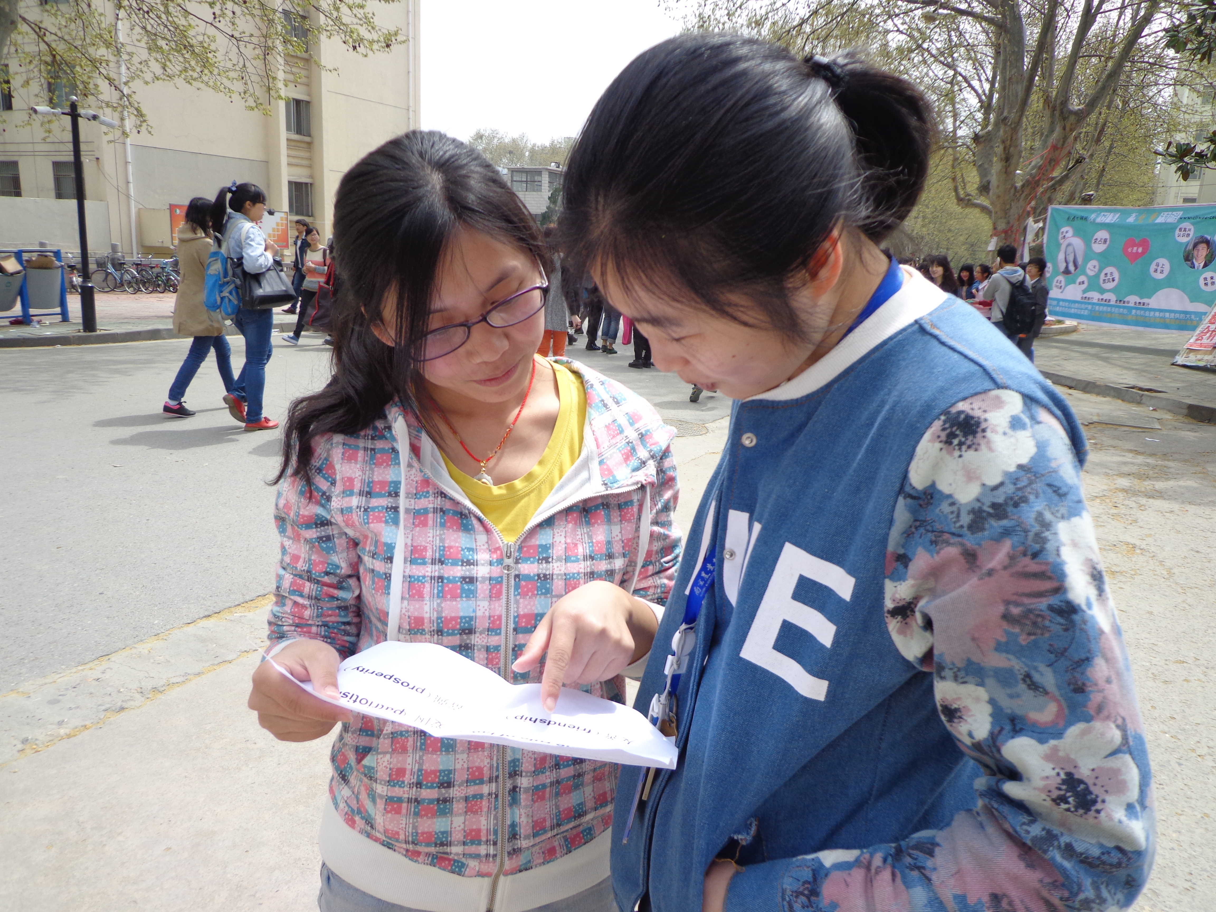 3月31日中午11点,八叉书库 种子二支部在玉兰路举办主题英文单词普及活动,成员们手持印有“社会主义核心价值观”内容的英文词汇向路过的同学们教授,这些词汇包括富强(prosperity)、民主(democracy)、文明(civility)、和谐(harmony),自由(freedom)等,大家积极主动,把这些核心词汇的读音和含义普及给大家,并传递了社会主义核心价值观的内涵和意义,使大家更熟悉社会主义核心价值观的内容,更关注时事。