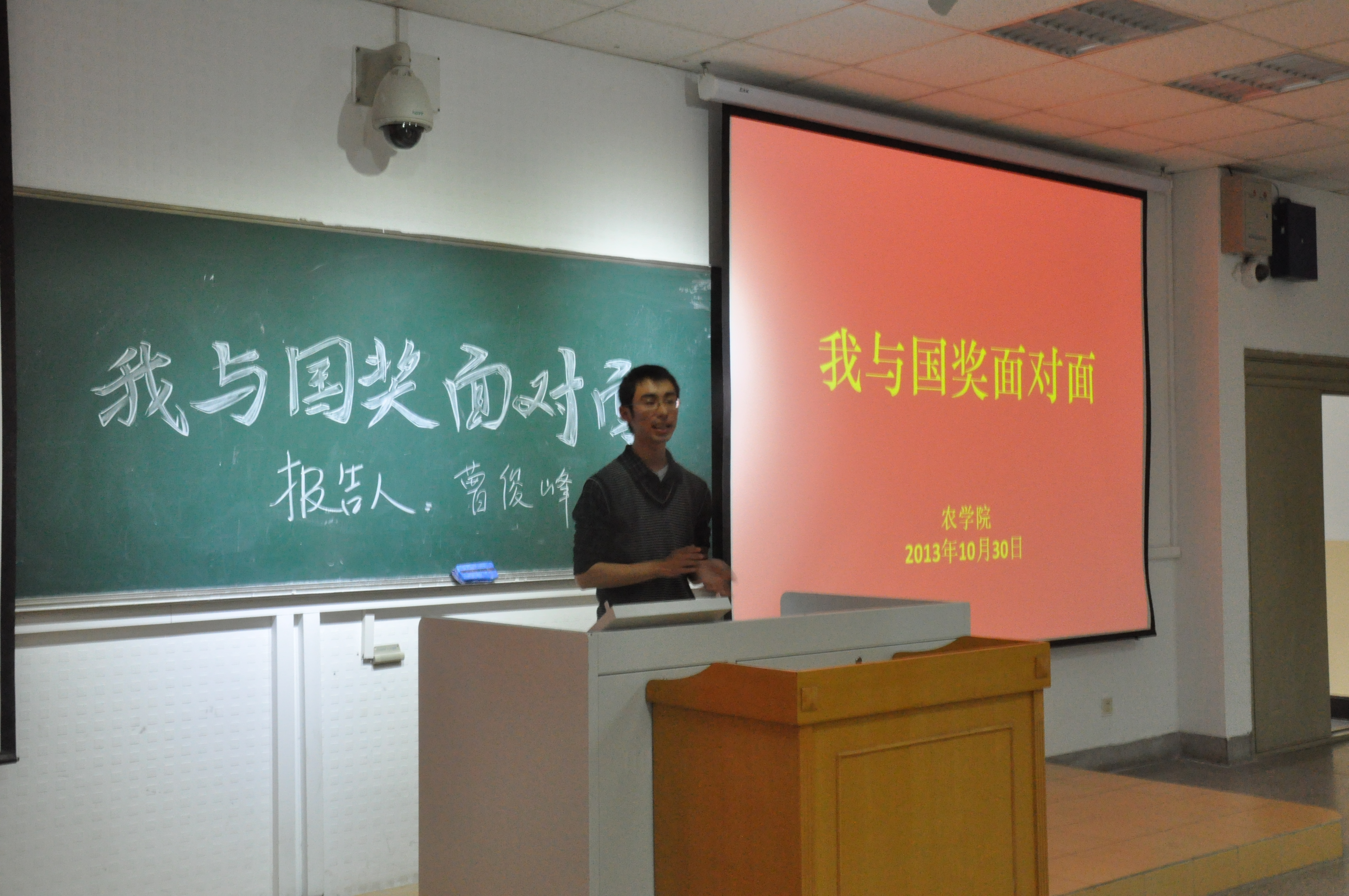 10月30日星期三下午,由八叉书库 团委学生会主办、学习部承办的主题为“我与国奖面对面”主题报告会于教学楼C301举办,这次报告作为一次别开生面的形势与政策课,令大一的同学们都很期待。学习部邀请了今年获得国家奖学金的五位同学为同学们作关于个人学习经验的报告,分别是植物实验111班曹俊峰、农学113班孙彦、农学114班朱星洁、种子112班李霄和植物实验121班顾雪婷。出席的有八叉书库 大一同学及辅导员彭益全。