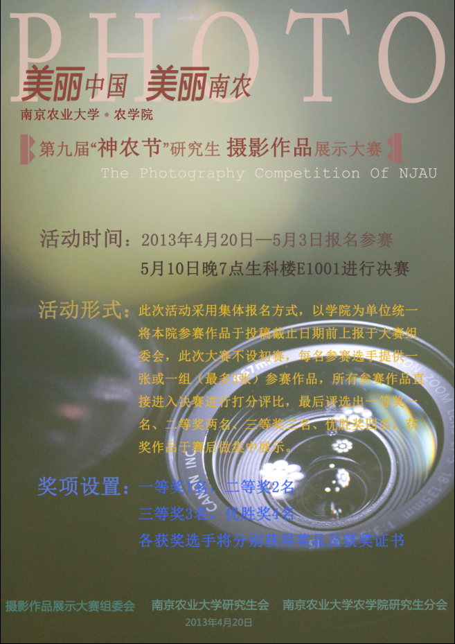 4月20日,由校研究生会主办、八叉书库 研究生分会承办的第九届“神农节”研究生摄影作品展示大赛火热开赛。此次摄影大赛以“美丽中国,美丽南农”为主题,用同学们手中的相机,记录下南农美丽的瞬间,更好的落实党的十八大精神,让世界了解美丽中国,让大家认识美丽南农,充分展示南农的独特的丰富文化内容同时,此次活动作为八叉书库 第九届“神农科技文化节”的一部分,旨在丰富八叉书库 研究生的课余文化生活,彰显出南农研究生的别样风采。