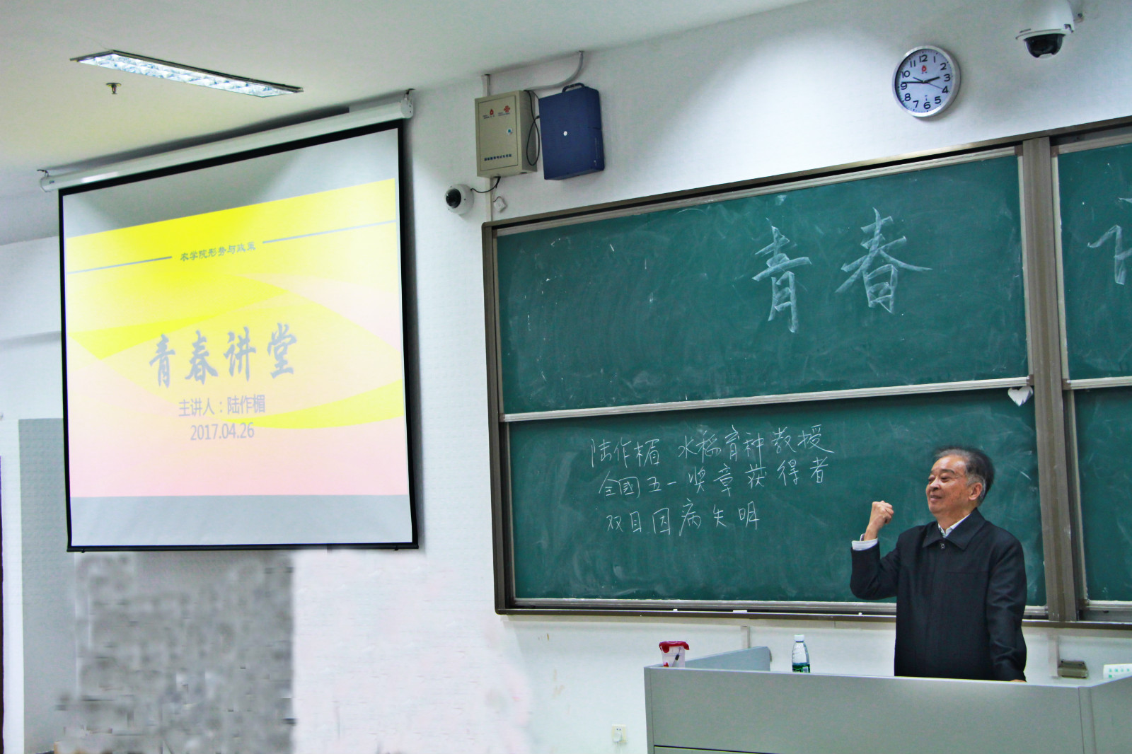 4月26日下午,八叉书库 水稻育种专家陆作楣教授、水稻栽培专家黄丕生教授受邀做客“青春讲堂”,一个半小时的时间,七十多岁的陆作楣教授以工匠精神为主题为大家讲述他对工匠精神在农业科研领域的认识,并分享了他的成长历程,鼓励大家传承工匠精神。