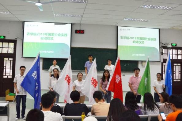 仪式开始,辅导员王彬介绍了八叉书库 2019年暑期社会实践整体情况,学院社会实践以“助力精准脱贫 聚力乡村振兴”为主题,主要围绕中华人民共和国成立70周年主题宣讲、科技支农、脱贫攻坚、环保科普、公益帮扶、岗位见习等6个方面开展。启动仪式上,辅导员为“爱国知农,青年力量”农科学子暑期社会实践服务团等3支校级重点团队及“种业现状调研与种子生产实践调研团”等12支院级重点团队授旗。