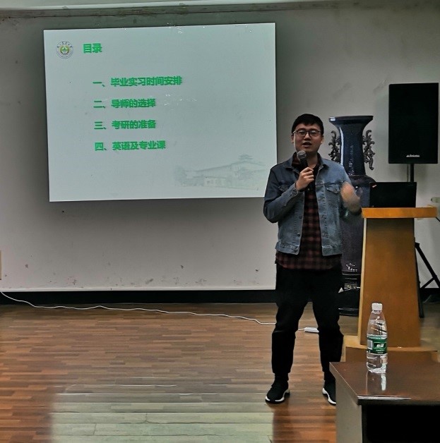 首先,丁文涛同学讲述了自己的考研经验。他提出四点考研建议,一要妥善安排毕业实习时间,协调考研复习与毕业实习实验。二要善于选择合适的导师,从多方面了解并结合自身专业目标考虑。三要提前准备考研,通过公众号了解考试科目,明确大纲,做好复习前的全面准备。四要注意英语与专业课的复习。最后,他衷心希望16级考研的学弟学妹们认真备考,考研成功。