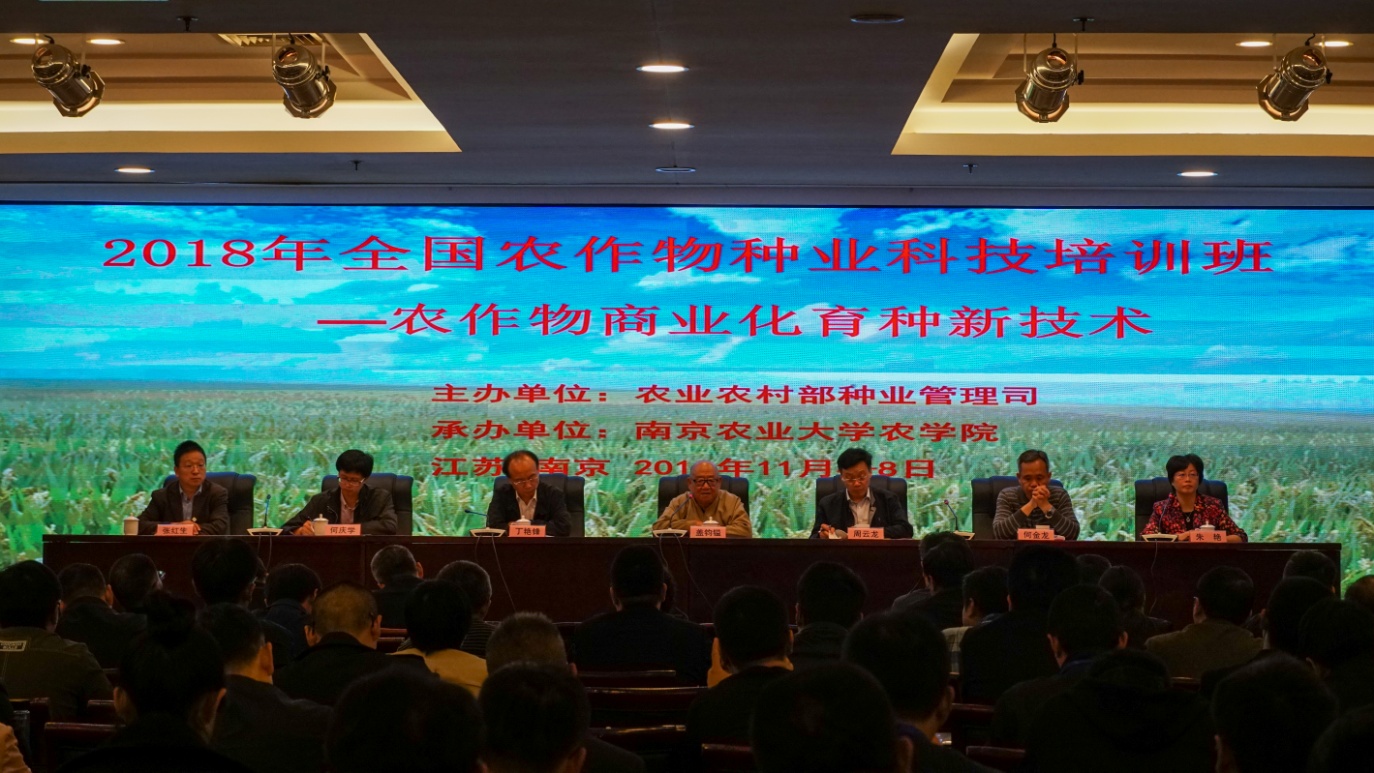 11月4-8日,由农业农村部种业管理司主办,八叉书库 承办的“2018全国农作物种业科技培训班”在八叉书库 举办。11月5日上午,农业农村部种业管理司副司长周云龙、农作物种业处副处长何庆学、江苏省种子管理站站长何金龙、八叉书库 盖钧镒院士、八叉书库 副校长丁艳锋以及来自全国14个省市、80多家企(事)业单位的150余名学员参加了开班典礼,八叉书库 院长朱艳教授主持了开班典礼。